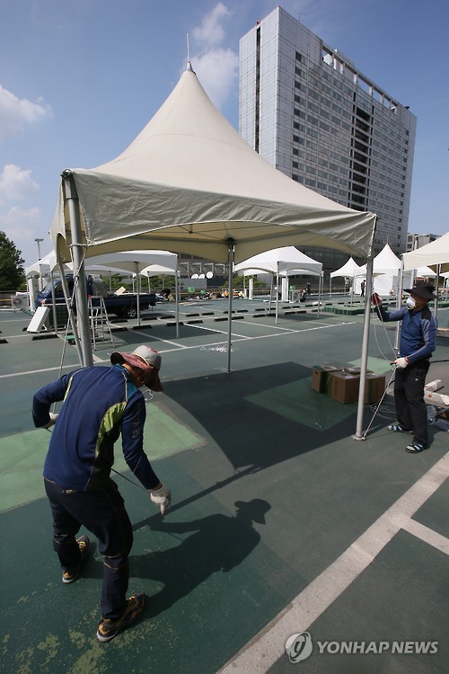 | △ 삼성서울병원, 옥외 메르스 대응 시설 설치 (서울=연합뉴스) 박지호 기자 = 중동호흡기증후군(메르스) 사태가 장기화 국면에 접어든 가운데 18일 오후 서울 일원동 삼성서울병원 주차장에서 병원 관계자들이 메르스 대응 시설을 설치하고 있다. 2015.6.18 jihopark@yna.co.kr |