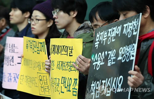| △ '세계 에이즈의 날'인 12월1일을 앞둔 2014년 11월 26일. 서울 중구 국가인권위원회 앞에서 에이즈환자 건강권 보장과 국립요양병원 마련을 위한 대책위원회 회원들이 기자회견을 열고 에이즈환자를 위해 국가직영 공공요양병원을 만들 것을 촉구하고 있다. |