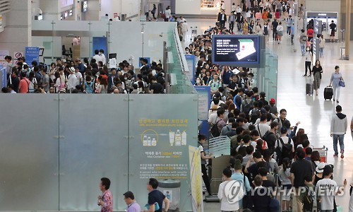 | △ 붐비는 인천공항 출국장 (영종도=연합뉴스) 이정훈 기자 = 2일 오전 인천국제공항 출국장이 해외로 떠나는 여행객으로 붐비고 있다. 인천국제공항 이용객 수가 전주 대비 증가세를 나타내며 중동호흡기증후군(메르스) 여파에서 회복하는 조짐을 보이고 있다. 2015.7.2 uwg806@yna.co.kr |