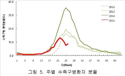 수족구병은 통상 봄철에 환자수가 늘어나 6월말~7월초(25~27주)에 환자수가 정점을 찍은 뒤 감소하는 경향을 보인다.