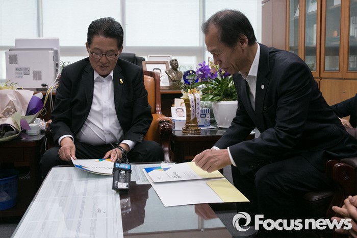 (서울=포커스뉴스) 박지원(왼쪽) 국민의당 원내대표가 16일 오전 서울 여의도 국회 의원회관을 방문한 최문순 강원도지사와 현안 관련 면담을 하고 있다.