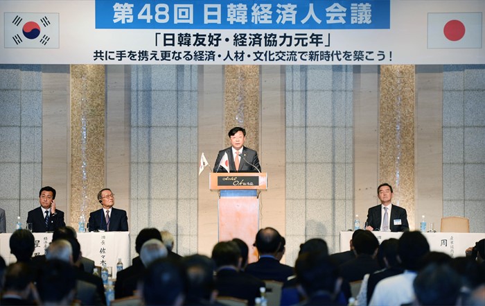 이날 회의에는 김 윤 한일경제협회장(삼양홀딩스 회장), 사사키 미키오(佐々木 幹夫) 일한경제협회장(미쓰비시상사 특별고문), 호시노 츠요시(星野 剛土) 경제산업대신정무관, 누카가 후쿠시로(額賀 福志郎) 일한의원연맹 회장, 유흥수 주일한국대사, 사카키바라 사다유키(榊原 定征) 일본경제단체연합회장, 박용만 대한상공회의소 회장, 미무라 아키오(三村 明夫) 일본상공회의소 회장 등 한일경제인 300여명이 참석했다. <사진제공=산업통상자원부>