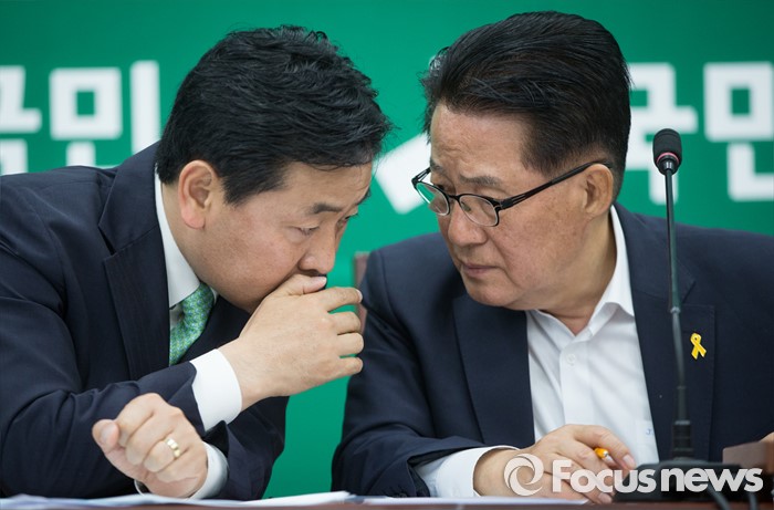 (서울=포커스뉴스) 김관영 국민의당 원내수석부대표가 19일 오전 서울 여의도 국회 국민의당 원내대책회의에서 박지원 원내대표에게 귀엣말을 하고 있다.