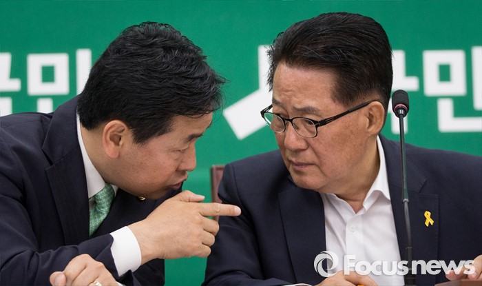 (서울=포커스뉴스) 김관영 국민의당 원내수석부대표가 19일 오전 서울 여의도 국회 국민의당 원내대책회의에서 박지원 원내대표에게 귀엣말을 하고 있다.