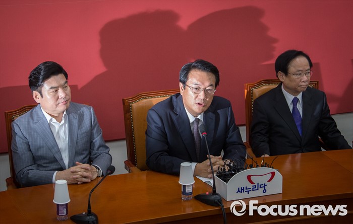 (서울=포커스뉴스) 정진석 새누리당 원내대표가 20일 오전 서울 여의도 국회에서 열린 원내지도부-중진의원 연석회의에 참석해 모두발언을 하고 있다. 왼쪽부터 원유철 전 원내대표, 정 원내대표, 이주영 의원.