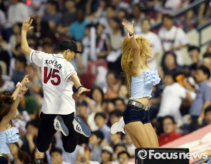 (서울=포커스뉴스) 23일 서울 잠실구장에서 열린 2016 프로야구 kt-두산 경기에서 두산 치어리더와 치어보이가 관중들에게 정열적인 춤을 선사하고 있다.